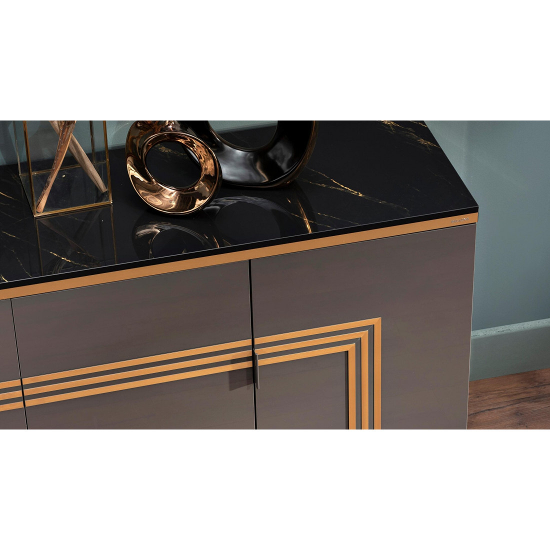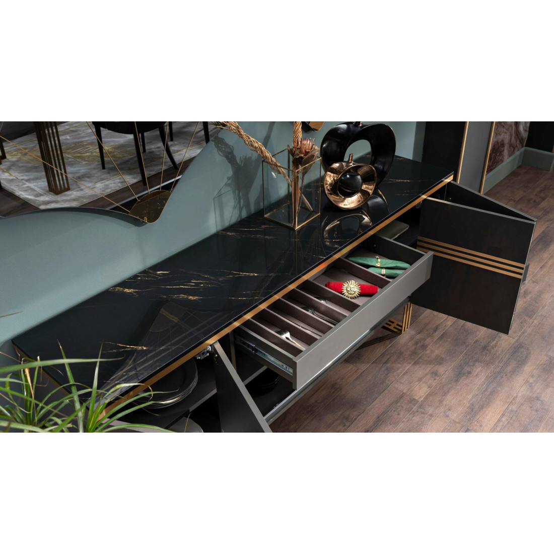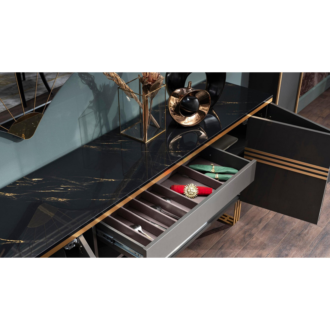 Длинный комод-буфет в гостиную Carlino CARL-10 выполнен в современном стиле Арт Деко. Его можно  использовать как для хранения посуды, так и для хранения вещей. Оригинальный дизайн, комбинация фасадов цвета антрацит с золотой отделкой, необыкновенные по стилю металлические ножки -все это притягивает взгляд и не оставляет никого  равнодушным. Комод длиной 2000мм , при относительно небольшой глубине 450мм прекрасно впишется в интерьер гостиной, столовой, спальни.За дверцами центральной части комода спрятан многофункиональный  выдвижной ящик. Дверцы комода плавно закрываются. Глянцевая  столешница черного цвета имеет золотистые мраморные разводы и отделана по контуру 3d кромкой.И как завершение композиции, дополнительный элемент комода -это комлпект из двух веерообразных зеркал  Карлино CARL-24.
