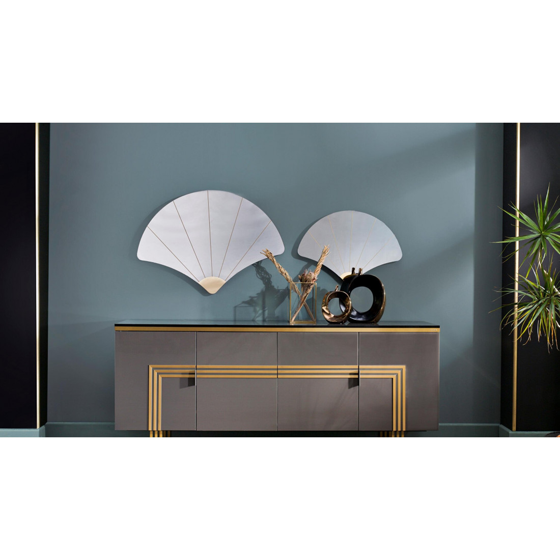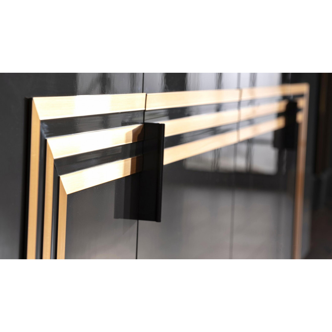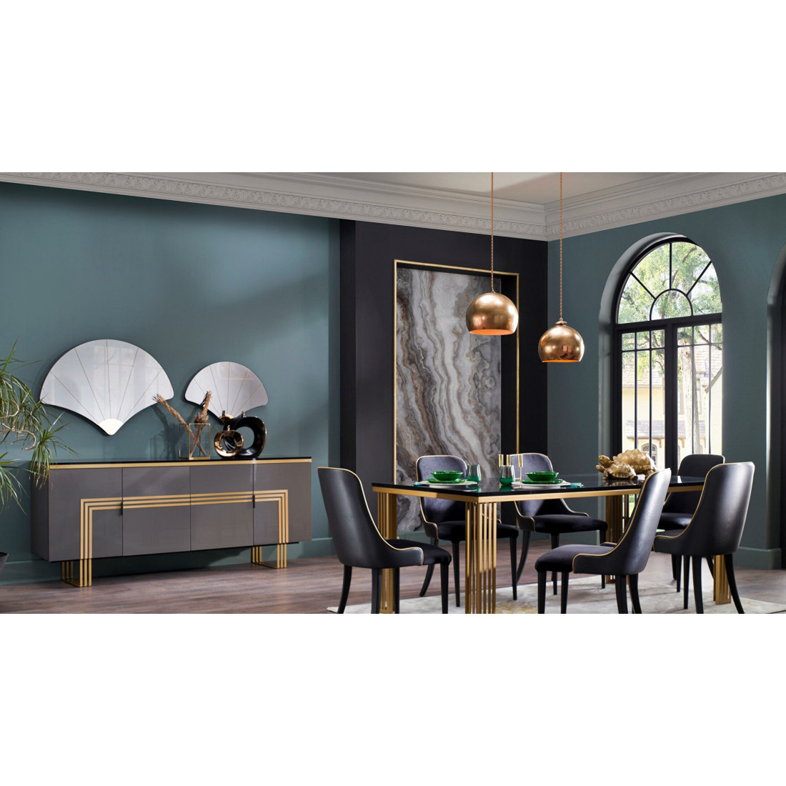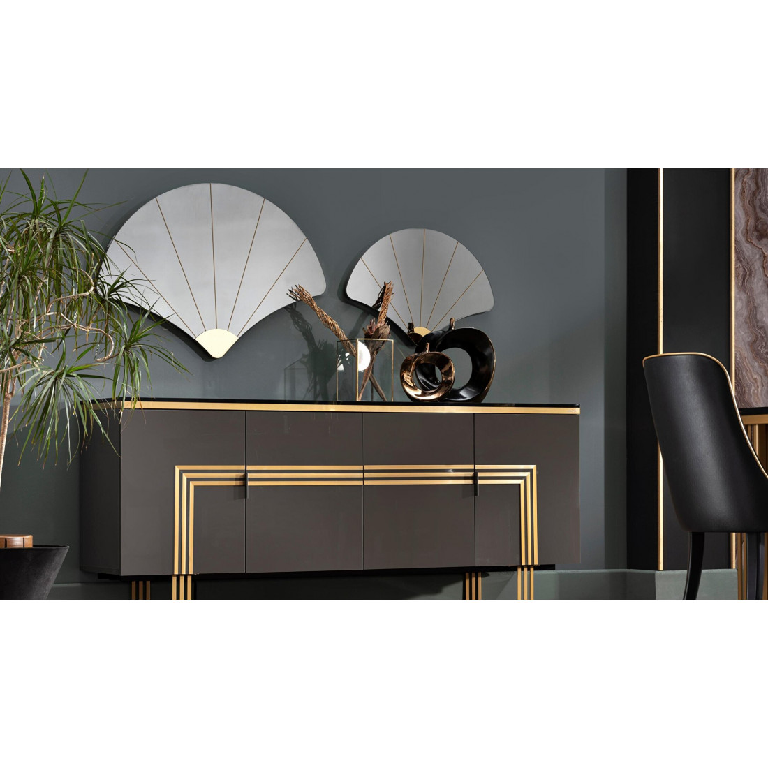 Длинный комод-буфет в гостиную Carlino CARL-10 выполнен в современном стиле Арт Деко. Его можно  использовать как для хранения посуды, так и для хранения вещей. Оригинальный дизайн, комбинация фасадов цвета антрацит с золотой отделкой, необыкновенные по стилю металлические ножки -все это притягивает взгляд и не оставляет никого  равнодушным. Комод длиной 2000мм , при относительно небольшой глубине 450мм прекрасно впишется в интерьер гостиной, столовой, спальни.За дверцами центральной части комода спрятан многофункиональный  выдвижной ящик. Дверцы комода плавно закрываются. Глянцевая  столешница черного цвета имеет золотистые мраморные разводы и отделана по контуру 3d кромкой.И как завершение композиции, дополнительный элемент комода -это комлпект из двух веерообразных зеркал  Карлино CARL-24.