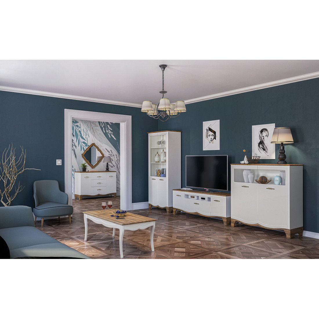 Классическая стенка для гостиной – это вовсе не громоздкая, массивная композиция, создающая в малогабаритной комнате ощущение замкнутости и тесноты. Убедиться в этом поможет полная легкости и изысканности модульная гостиная Тиффани от фабрики Мебель-Неман. Выполнена в очаровательном французском стиле, она предельна невосома и изящна, и в тоже время – вместительна и функциональна.
