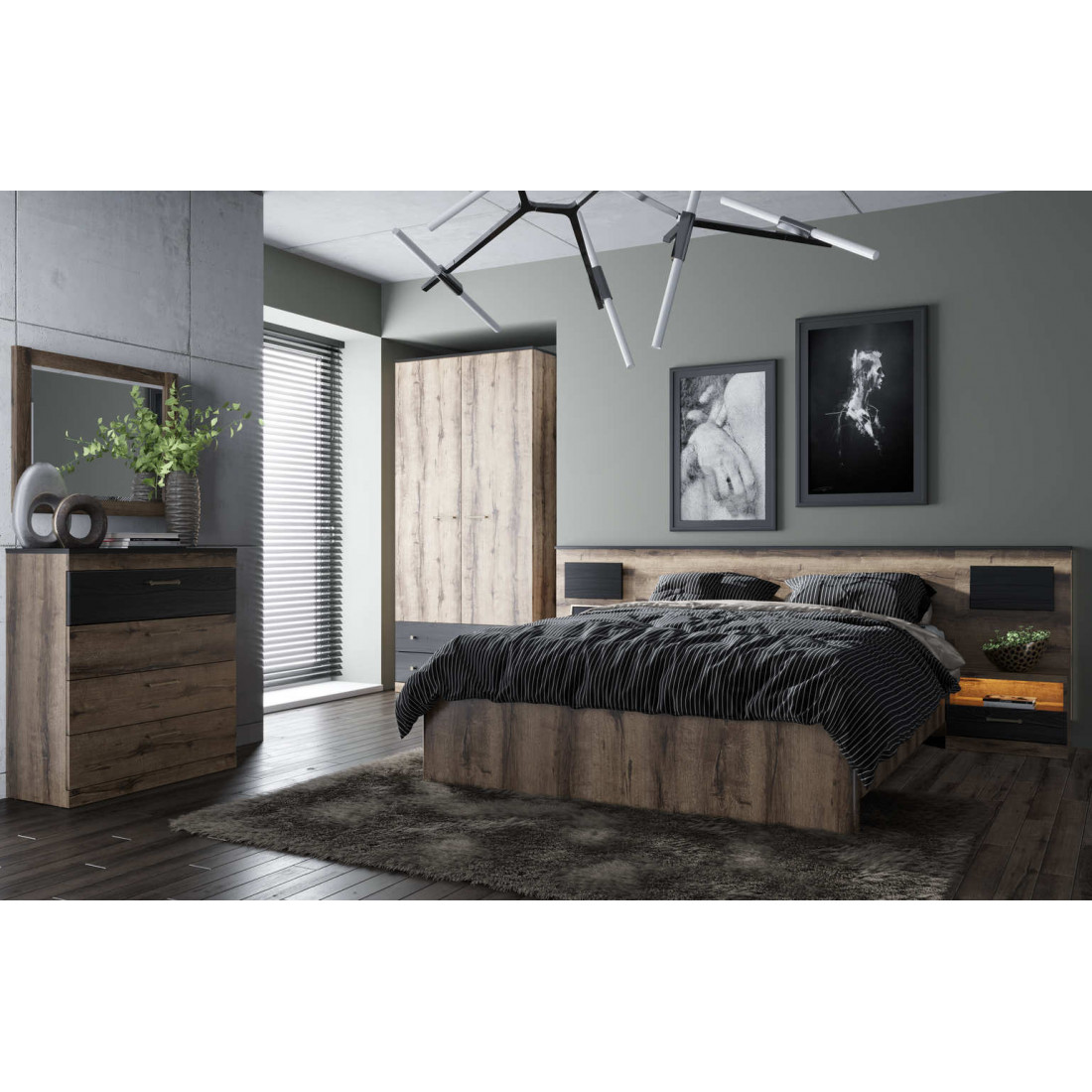 Отличительная черта спальни Джаггер - сочетание контрастов. Это современная мебель, которая хорошо смотрится как в современном, так и в классическом интерьере. Эта многомерность и универсальность были достигнуты благодаря умелому сочетанию дуба монастырского и части фасадов, поддерживаемых в черном цвете.