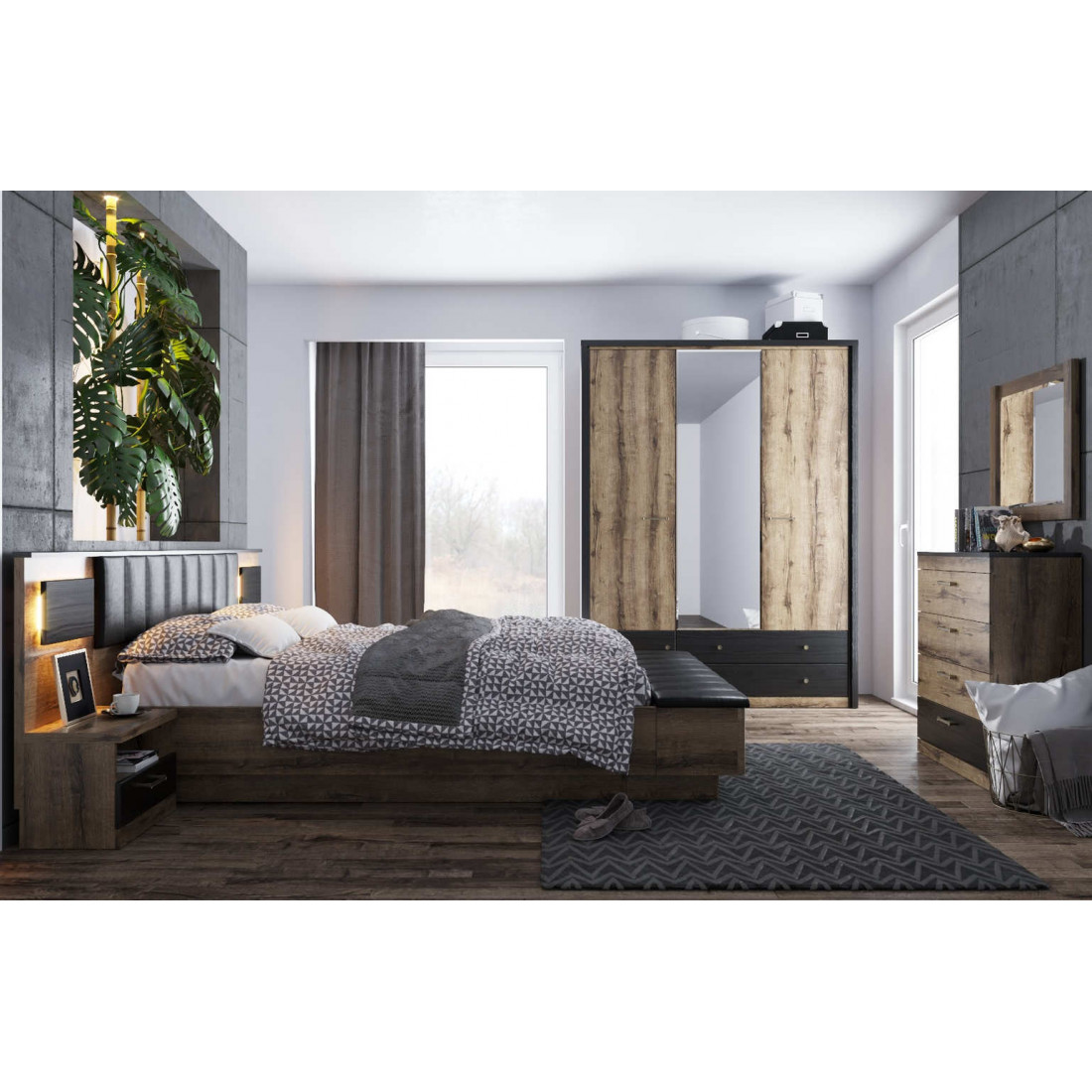 Отличительная черта спальни Джаггер - сочетание контрастов. Это современная мебель, которая хорошо смотрится как в современном, так и в классическом интерьере. Эта многомерность и универсальность были достигнуты благодаря умелому сочетанию дуба монастырского и части фасадов, поддерживаемых в черном цвете.