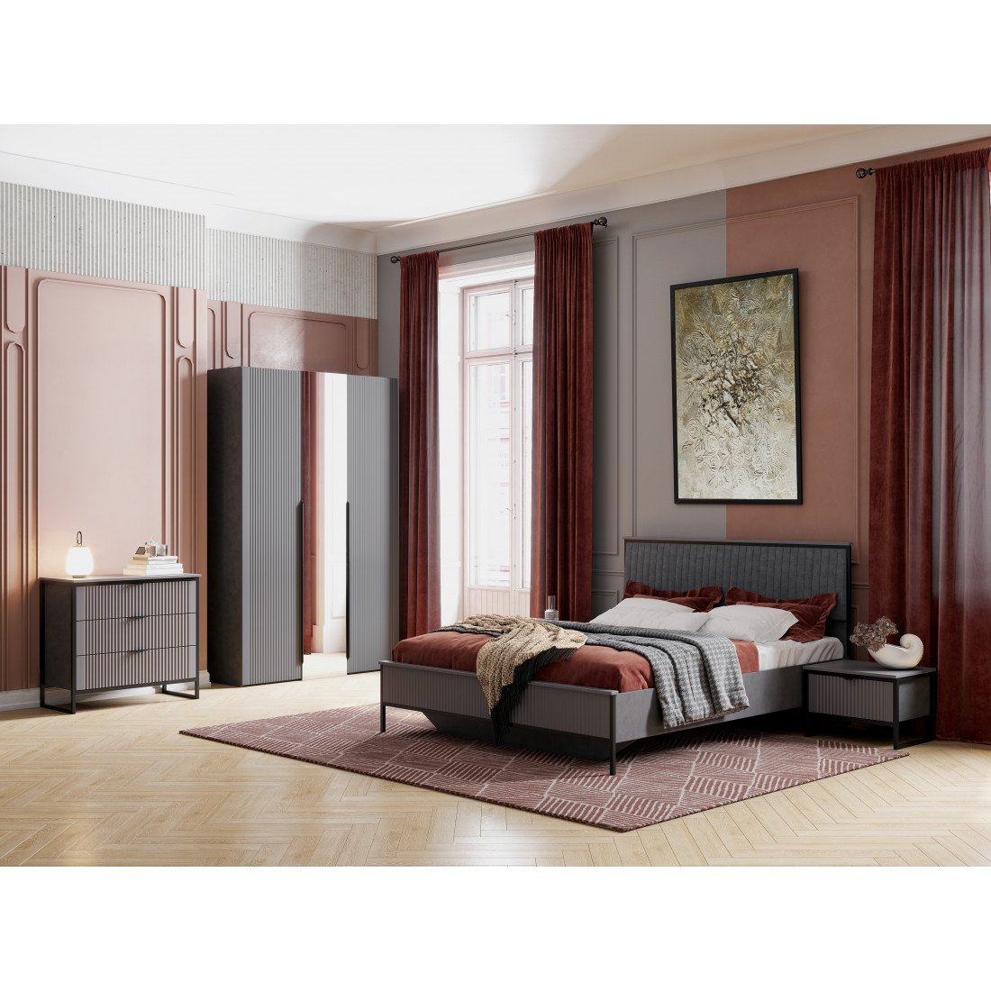 Гарнитур подходит как для просторных, так и для небольших спален, помогая эффективно использовать пространство и создавать уютное место для отдыха и сна.