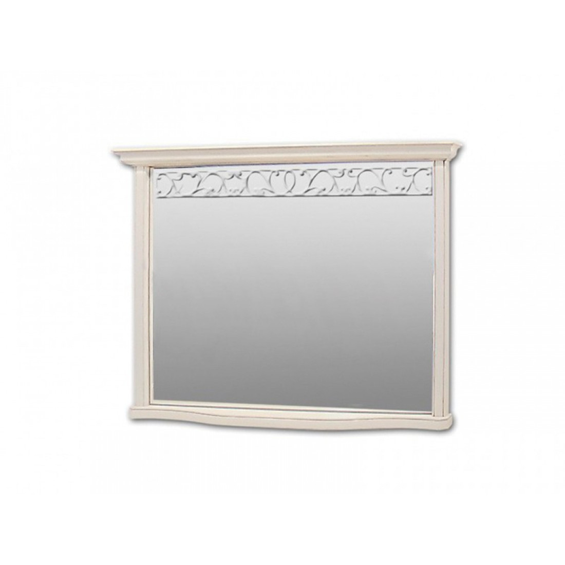 Классическое прямоугольное зеркало в раме из массива дуба из коллекции "Оскар". Декорировано высоким карнизом, фацетом и лазерной гравировкой на поверхности зеркала. Крепится на стену. Выполнено в оттенке "белая эмаль с патиной".